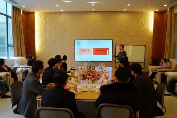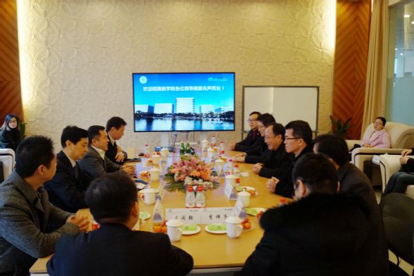 参观结束后,我院一行与江苏先声药业杨孝华书记等开展了深入交流与座谈。首先,杨书记简要介绍了先声药业集团的发展历史、药物研发、人才引进、对外科研合作及药品上市情况等,并就精准医疗百家汇开放的创新创业平台合作、运营的激励机制及资源分配机制等进行了详细阐述。随后,韩军介绍了皖南医学院的发展历程、我院的组织机构、办学条件、科研机构、科研平台与成果及人才培养等情况,并就如何开展校企合作、与企业创新联动机制、搭建人才培养平台等提出了自己的思路与理念。座谈上,与会双方人员分别就科研合作、人才培养、科技成果转化及合作办学等方面进行了深入交流,达成了初步统一意见,并就如何进一步的深度产学研合作进行了探讨。之后,陆剑雪副总裁就双方达成的共识进行了简要总结,表示非常欢迎与皖医我院加强深度合作,接下来会逐步落实,取得实效。