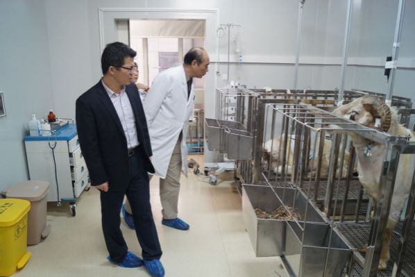 图三 参观正在大动物羊身上开展的磁液悬浮离心血泵科研项目