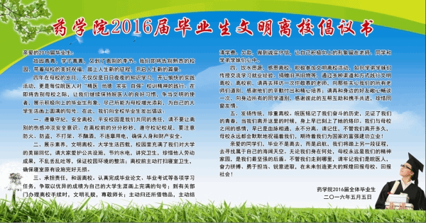 离校倡议,留下文明。开学初,我院便通过校园网、宣传板、QQ群、微博等多种形式向全体毕业生发出《我院2016届毕业生文明离校倡议书》,号召大家以健康文明的方式告别母校;5月初,利用毕业生返校参加毕业考试之际,我院组织毕业班级召开系列文明离校主题班会,希望每位毕业生珍惜在校的最后时光,一如既往地严格遵守学校的各项规章制度,发扬优良传统,感恩母校、文明离校。
