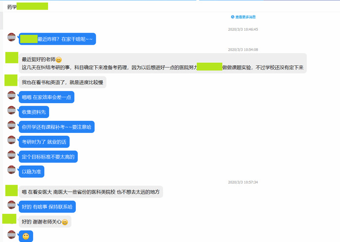 答疑解惑,贴心走心,师生互动不断线。疫情期间,学生长期在家容易产生思想和心理波动。针对这一情况,我院辅导员及时关注学生动态,积极引导学生们关注时政、科学防疫、养成良好生活习惯、克服紧张焦虑情绪,用积极的心态面对疫情,用认真的态度完成今日校园每日打卡和学习任务。各年级辅导员通过各种在线方式对学生在网络课堂、毕业论文、考研复试、就业求职等方面产生的问题和困惑及时给予解答和引导,帮助同学们合理规划时间,让这个特殊假期过得更有价值、更有意义。