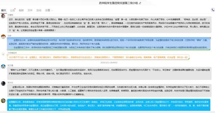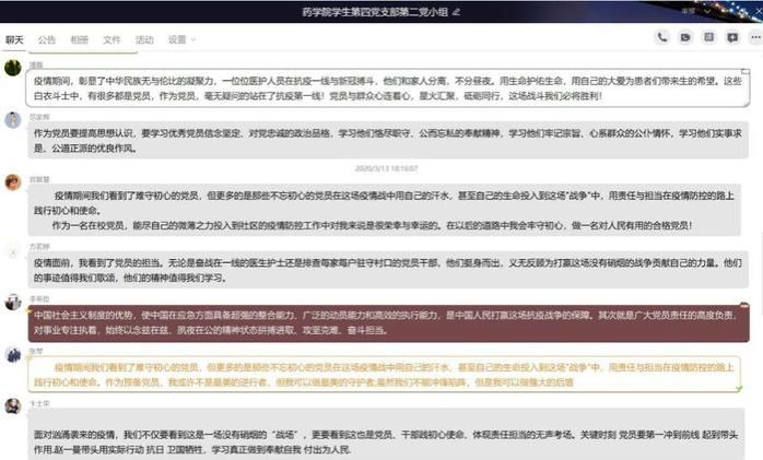 在疫情期间,为了加强支部基层党组织凝聚力,加强对党员的学习教育,3月13-16日,我院学生第四党支部以网络平台为载体,支部老师带领三个党小组的学生党员分别开展了在线党员活动日学习,分享疫情发生以来各地党组织担当的宝贵经验,号召全体党员在特殊时期充分发挥党员的先锋模范作用。