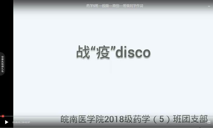 唱青春,隔离病毒不隔离爱。2018级药学5班全班齐上阵,自行改编、演出、剪辑、演唱,共同制作了一首“战′疫′disco”。通过朗朗上口的歌词和欢快的曲调,号召同学们在家抗疫,不信谣不传谣,做好防护。同时歌曲饱含对疫区人民的鼓励和对未来的祝福,同学们用歌声用青春传递力量和温暖,诠释青年的责任与担当。