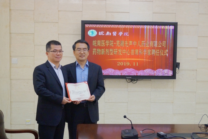 在校企交流座谈中,韩军对史瑞文副总裁一行表示热烈欢迎,对学校、我院基本情况进行了简要介绍,并对先声药业集团一直以来支持我校医药教育事业发展,出资共建“药物新剂型研发中心”,促进药物研发队伍建设、人才培养、学科发展等表示感谢,对后续多方位合作提出了一些意见和建议。徐刚对先声药业集团、芜湖先声中人药业有限公司企业情况进行了介绍,对与我校就人才培养、项目申报、科研共建等方面的合作进行了简要总结,对校企共建“药物新剂型研发中心”项目的推进情况进行了介绍,并就后续的合作提出了一些的方案。随后,双方与会人员就科研平台共建、项目投入等具体合作事宜展开了深入交流,对多方位合作的切入点进行了进一步探讨。在交流中,史瑞文指出,药物新剂型研发中心项目推进要注重建设实效,校企双方可在技术层面和产品方向上进行协商,确定切实可行的方案和目标,确保一至两年内能出部分成果。韩军指出校企合作要加强科研团队的建设,多交流、多接触、多探讨,打通校企双方团队协作通道;校企合作可以取长补短,互惠共赢,学院将协同企业共同推进和开展下一步的项目建设。之后,开展了“药物新剂型研发中心”首席科学家聘任仪式,韩军向史瑞文副总裁颁发了研发中心首席科学家聘书。座谈交流结束后,史瑞文一行在韩军等陪同下参观了安徽省多糖药物工程技术研究中心、校企合作药物新剂型研发中心、学校医用材料合成应用研究所等科研平台。