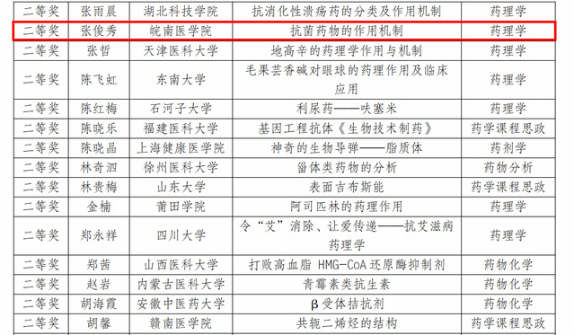 本次大赛来自中国药科大学、沈阳药科大学、浙江大学、复旦大学、四川大学、山东大学、中山大学等93所高校的青年教师们共提交了273件参赛作品,经专家网络评审, 最终我院张俊秀老师凭借参赛作品《抗菌药物的作用机制》(《药理学》课程)获得微课教学大赛二等奖。