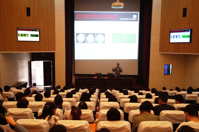施健研究员结合自身多年科研经历,以目前心血管疾病在离子通道领域研究热点入手,从整体动物、分子水平、基因水平等,系统阐述了应用小电导高分辨率单通道记录技术在血管平滑肌细胞和血管内皮细胞中实时研究阳离子通透性TRP通道和Piezo1通道的药理调控功能与相应药物干涉机制,探索治疗心血管疾病的新型特异性药物。随后,施健简单介绍了利兹大学医学部,并期待我校青年骨干教师和优秀研究生赴英学习交流。最后,施健还就师生们的提问做了详细的解答。整场学术报告观念新颖、见解独到,受到了与会师生们的热烈响应。