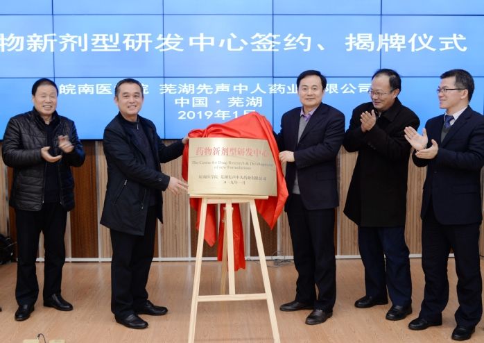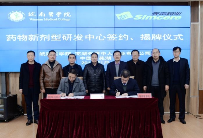 2019年1月11日下午,我校与江苏先声药业集团芜湖先声中人药业有限公司在四号实验楼2楼会议室举行了“药物新剂型研发中心”暨校企合作签约、揭牌仪式。芜湖市药学会会长杨作春,先声药业集团政府事务总监陈闽赣,芜湖先声中人药业有限公司总经理徐刚、副总经理韩新宁、副总经理朱伟,我校副院长廖圣宝,科研处副处长朱再满,我院党委书记李康才、院长韩军、副院长年四辉,以及双方有关部门负责人出席了签约、揭牌仪式。仪式由朱再满主持。