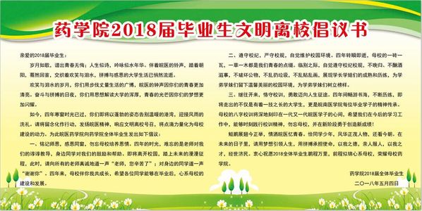 “致青春”文明离校倡议书。我院通过网络、宣传板、QQ群等多种形式,向全校毕业生发出了《我院2018届毕业生文明离校倡议书》,号召大家以健康文明的方式告别母校。5月利用毕业生返校参加毕业考试之际,我院组织毕业班级召开文明离校主题班会,希望每位毕业生珍惜在校的最后时光,遵守学校的各项规章制度,发扬优良传统,感恩母校,共同营造出文明离校的良好氛围。