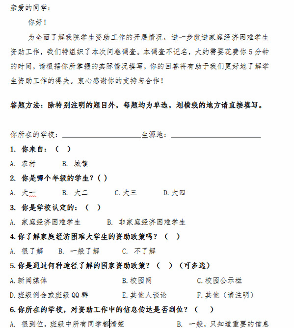 精准资助:量化测评,了解学生。为全面了解学生情况,更好的深入班级做好学生资助工作,进一步改进家庭经济困难学生资助工作,推动资助工作健康良性发展,2015级组织开展问卷调查活动进一步了解学生对于资助政策以及学校、学院、年级对于资助工作开展情况的了解程度。