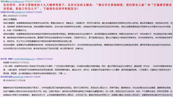 主题资助:全面提升,学会发展。学院利用团委公众号、QQ群等线上方式组织受资助同学围绕新时代、新使命、新征程背景下“如何进一步健全学生资助制度”、“如何为打赢教育脱贫攻坚战出好力”为主题,开展学习、讨论和实践活动。董婷玉同学说:“辅导员可以根据学生提交的家庭经济情况调查表和实地走访,对学生家庭经济情况进行梳理。新生年级可以在新生刚进校时通过家长谈话等方式对班级学生家庭情况进行初步的了解”。林万华同学说:“严格规范资助工作的认定程序,保证资助公正公平”。通过搜集学生的意见和建议,便于今后学院进一步提高资助工作效率、工作质量,全面提升资助工作水平。