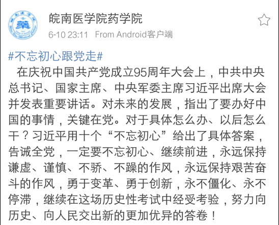 紧密团结党中央,永远跟党走。我院通过团委微博、微信以及QQ平台进行“不忘初心跟党走-永远跟党走”的主题推送,积极引导广大团员紧密团结以习近平同志为核心的党中央,在思想上、政治上、行动上与党中央保持高度一致,加深了广大团员青年对社会主义核心价值观内容的认识与领悟。