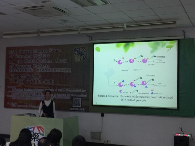 在两天的会议中,来自全国共46所院校200余名代表做了报告,就药学科学和药学服务等热点领域和成果进行了广泛的探讨与深入的交流。我院何丹同学以题为《靶向Plk1 PBD小分子抑制剂荧光偏振高通量筛选模型的建立》向大会作了壁报展示和交流报告,并获得“全国大学生创新成果三等奖”。
