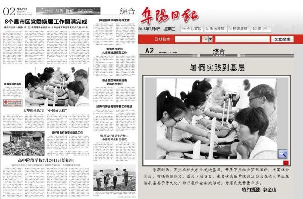 我院2015级“皖医医疗行”志愿服务队立足我院的专业优势,结合皖医力量,关注社会民生热点,在阜阳积极开展暑期“三下乡”社会实践活动,引起阜阳日报、临泉网等媒体的广泛关注,受到实践单位和社会的一致好评。为其他实践团带了个好头,为我院“三下乡”暑期社会实践活动拉开帷幕。