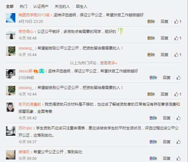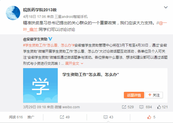 活动开始后,我院2013级开通了“皖医我院2013级”新浪微博,线上关注“安徽学生资助”官方微博,同时转发评论最新微博《学生资助工作“怎么看、怎么办”》,吸引了同学们的广泛关注,大家纷纷参与微话题讨论活动。同学们积极提出在学生资助工作上的问题以及对更好的开展学生资助工作的宝贵意见,如:除去上交材料作为参考,应全面了解被资助者的平时生活水平;坚持评选透明、公平公正,做到精准助学等。微博管理员会持续关注、整理同学提出的问题与意见并及时反馈给年级,以期进一步提高和改进。