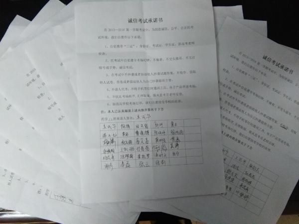 2015级学生自觉开展考试诚信承诺书签名活动,活动以班级为单位。各班班长宣读《诚信考试承诺书》,辅导员对其进行讲解,强调诚信考试的重要性,明确指出考试作弊的危害,每位同学在考试诚信承诺书上签名,表示以身作则,遵守考风考纪,拒绝作弊行为。签字活动不仅仅是一种形式,更重要的是为了践行社会主义核心价值观,督促同学们树立考试自律意识,端正学习态度,取得优异成绩。