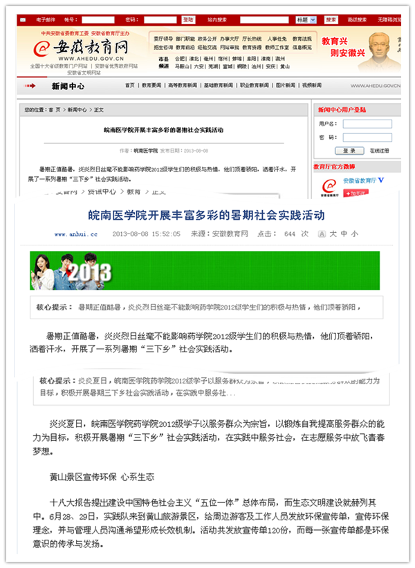 暑期“三下乡”是大学生重要的社会实践活动,我院领导给予了高度重视,对整个实践过程做了精心布置,在实践活动初期早动员、早谋划、早准备,老师和同学都积极出谋划策,结合我院专业优势,采取“集中组队为主,个人实践为辅”的活动方式,共组织了700多名志愿者,60多支小分队,不畏酷暑、满怀豪情地深入合肥、芜湖、蚌埠、安庆、阜阳、淮南、亳州、池州、宣城、六安、黄山等十余个地市,开展了有专业特色的医疗宣传、普及用药知识、回访母校、社会调研、关爱老幼等运用药学、医学专业知识进行的实践活动以及宣传环保、新农村发展调查、义务支教、廉政建设等一系列形式多样、内容丰富的志愿服务和社会实践活动。实践队还借助新媒体如微博、QQ空间、视频网站等方式进行了广泛宣传。整个服务队在实践期间发放了15000份的宣传材料,进行了十余个项目的问卷调查,帮助服务群众2500人次,并取得了可喜的成绩,受到了各地群众的高度好评和多家新闻媒体的广泛关注。