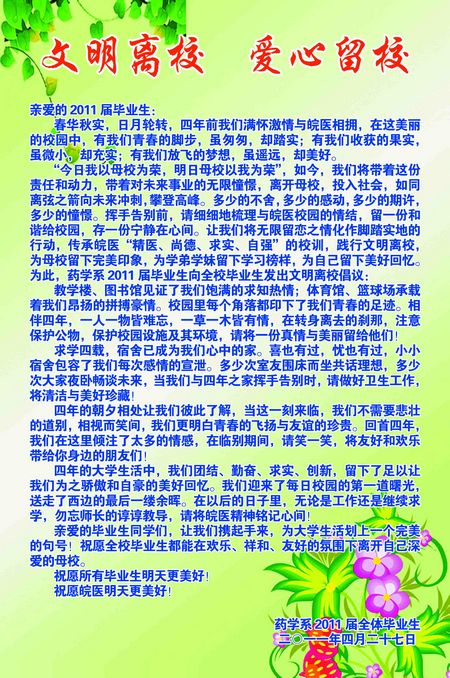 按照学院《关于开展毕业生文明离校活动的通知》精神,药学系通过召开系党政联席会议、年级党支部大会、悬挂横幅、发起倡议等形式,正式拉开了毕业生文明离校活动的帷幕。