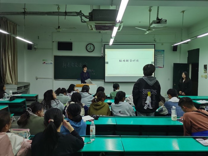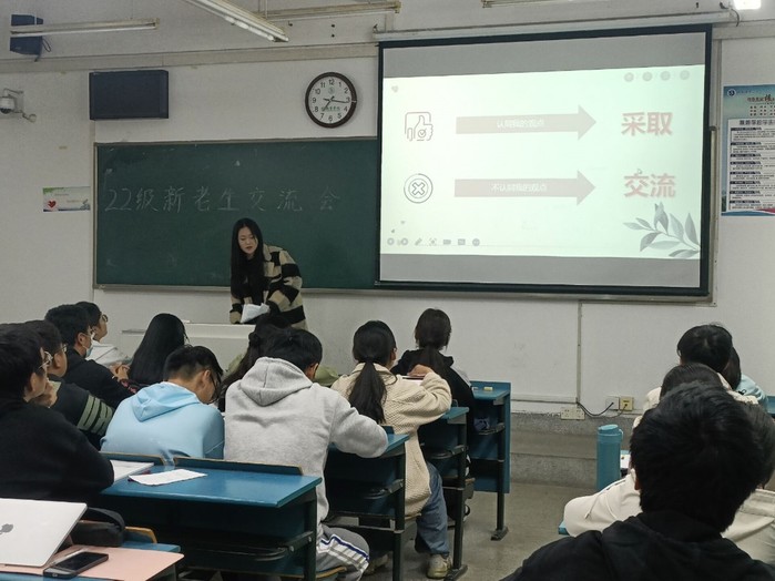 交流会分为经验分享和提问答疑两个环节。优秀学生代表从角色转变、学习方法、时间管理等新生面临的共性问题着手,结合一年来的收获与遗憾,分享了自己的学习生活心得体会,以及如何备考英语四六级等,启发新生树立正确的学习观念、合理安排时间、科学规划目标,通过各类有益的活动丰富大学生活、拓展视野、提高自身综合素质。在提问答疑环节,新生积极踊跃发言,结合自己的疑问与困惑向老生们求教,老生代表认真而细致答疑解惑,给新生们指出了具体适宜的解决办法,帮助他们更好开启大学新生活。