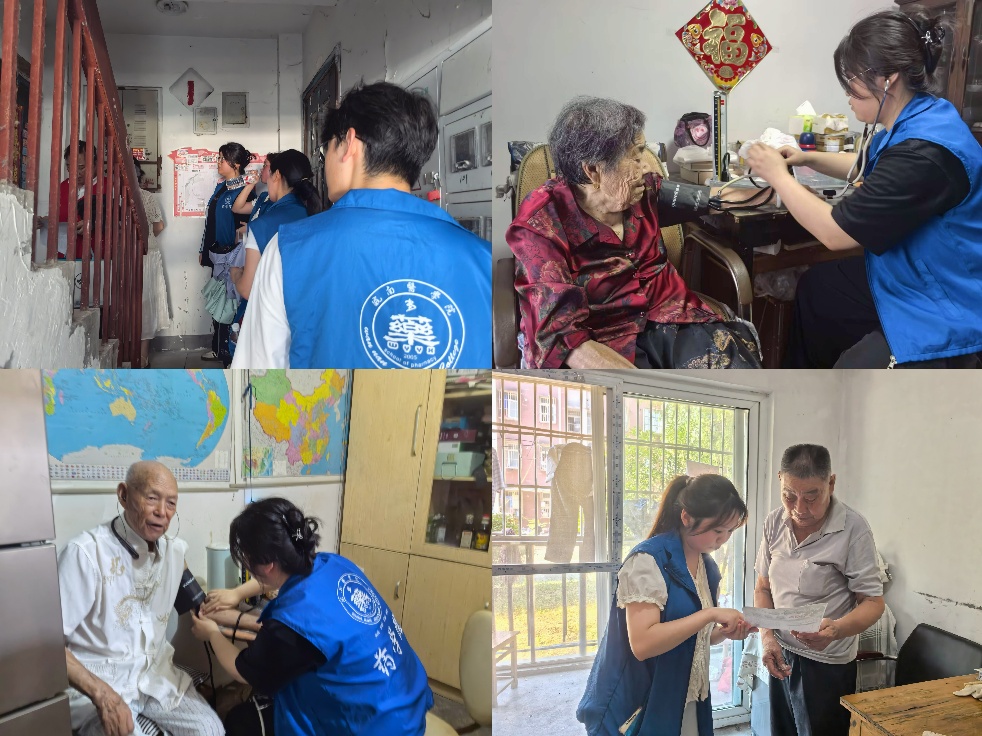 健康入户暖民心。活动期间,服务队负责人以身作则,带领队员分组深入蓝湾半岛小区,为困难党员、低保户及“三无”老人提供“一对一” 的贴心健康关爱服务。队员们凭借扎实的专业知识,仔细为老人们测量血压,并为其建立详细的健康档案。同时,结合夏季养生的特点,队员们精心发放团队原创的《中医药夏季养生指南》和《中药煎服科学方法》宣传单,耐心地为老人们讲解防暑降温、饮食调养等中医保健知识,用实际行动传递着温暖与关怀。“感谢党和皖南医学院的孩子们,把这么贴心的服务送到家里!” 一位老党员紧紧握住志愿者的手,激动地连连称赞。