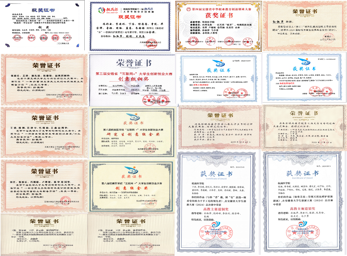 迄今为止,美容药剂科研兴趣小组培养学生300余名,成效显著,小组共承担科研项目20余项,发表论文50余篇,获授权发明专利90余项,其中60余项成功与企业实现对接。小组在国家级、省市级各类竞赛中获奖100余项,包括德国纽伦堡国际发明展三等奖1项、全国发明展三等奖1项、国家级挑战杯三等奖1项、省挑战杯一等奖1项、“第二届全国医药院校药学/中药学世界大学生创新创业暨实验教学改革大赛”一等奖1项、省级创新创业大赛二等奖1项、银奖6项、铜奖10余项,获芜湖市专利创新大赛特等奖3项、一等奖4项。200余人攻读研究生。(张梦婷、孙淑萍 文/图)