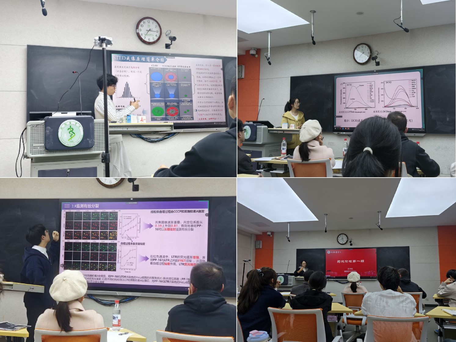 在此次论坛中,2022级临床药学专业汪捷同学分析了STED与FLIM技术在脂滴成像中的优势,从探针构建到功能验证展现了超分辨成像在动态监测与定量分析中的突破;2023级药学专业黄程同学聚焦近红外荧光探针,结合共聚焦与3D多色成像技术,阐释了其在脂滴极性检测与细胞器互作研究中的应用潜力;2023级药学专业万李飞扬同学则展示了基于FRET机制与长烷基链锚定的线粒体探针,该设计突破了传统定位局限,实现了线粒体粘度变化的实时监测与肝损伤早期可视化分析。整场报告学术气氛热烈,师生围绕成像技术的选择标准、探针设计策略及其在药学领域的应用前景展开了深入讨论。