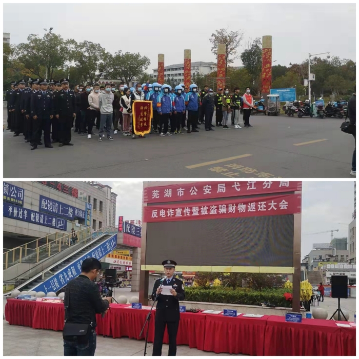 大会从常见的电信诈骗手段、诈骗信息的识别、预防诈骗事件的方法以及诈骗经典案例等多个方面向参会群众介绍了防诈方法,帮助群众辨析诈骗信息,保障财产安全。会中,由弋江公安分局牵头,现场返还多位受害人因电信诈骗损失财产。