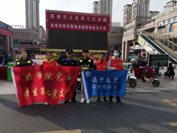 为提高防诈骗意识,保障群众的生命财产安全,提高同学们防诈骗的意识和能力,11月20日下午,我院学生第二党支部党员、发展对象、入党积极分子协助芜湖市弋江公安分局开展反电信诈骗宣传暨被盗财物返还大会。