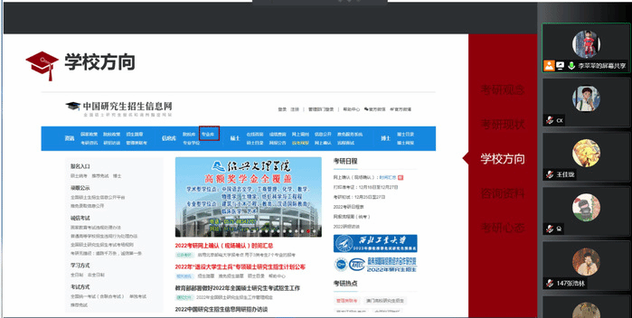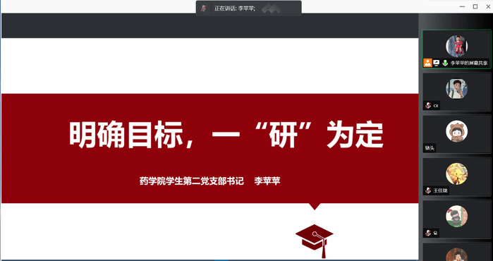 开展讲座,帮助学生走出困惑。为帮助有考研意愿的同学解除疑惑,明确奋斗目标,2021年11月9日,我院学生第二党支部书记李苹苹在线上开展“明确目标,一研为定”的考研专题讲座。本次讲座从考研观念、考研现状、学校方向、咨询资料和考研心态等五个方面向同学们详细地阐述了考研相关问题。此次考研讲座的成功举办,为准备考研的同学们指明了学习方向。