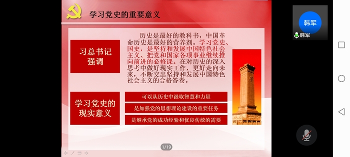 4月29日,我院院长韩军以“学习百年党史,践行责任担当”为主题线上讲授党课。他从学习百年党史的重要意义引入,梳理了党史的发展脉络,结合当下青年学生的特点和现状,围绕树立远大理想、热爱伟大祖国、担当时代责任、勇于砥砺奋斗、练就过硬本领、锤炼品德修为等六个方面引导全体学员要勤于学习、勤于领悟,增强自我历史使命感和责任感,把爱国之情、报国之志融入祖国改革发展的伟大事业之中、融入人民创造历史的伟大奋斗之中,争做新时代新青年。