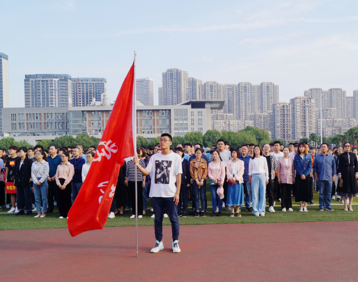 金秋时节,惠风和畅。伴随着雄壮激烈、催人奋进的《义勇军进行曲》,鲜艳的五星红旗冉冉升起,在场人员庄严肃立,面向国旗行注目礼,为伟大祖国送上深情祝福。