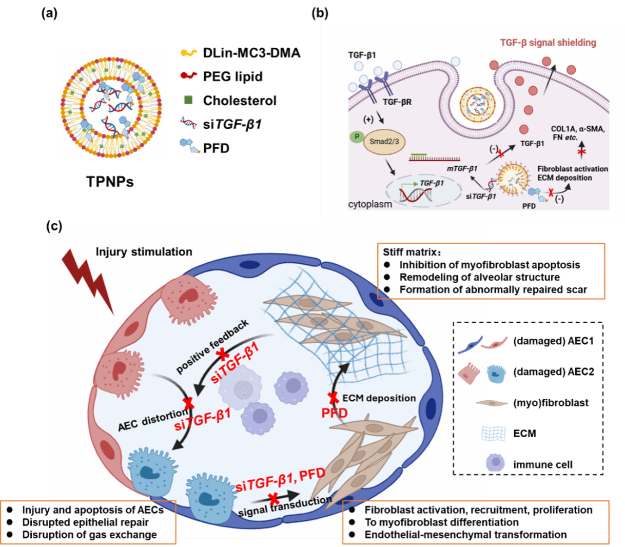 针对这一问题,在前期相关工作的基础上(ACS Appl. Mater. Interfaces, 2024, 16, 20260),研究团队开发了一种同时负载转化细胞生长因子(TGF-β1)小干扰RNA(siTGF-β1)和吡非尼酮(PFD)的新型可电离脂质体纳米药物(TPNPs),用于同时干预上皮-间质转化(EMT)、肺泡上皮细胞凋亡及成纤维细胞分化和迁移等过程,通过多病理过程协同互补机制,实现对IPF治疗效果的增强。